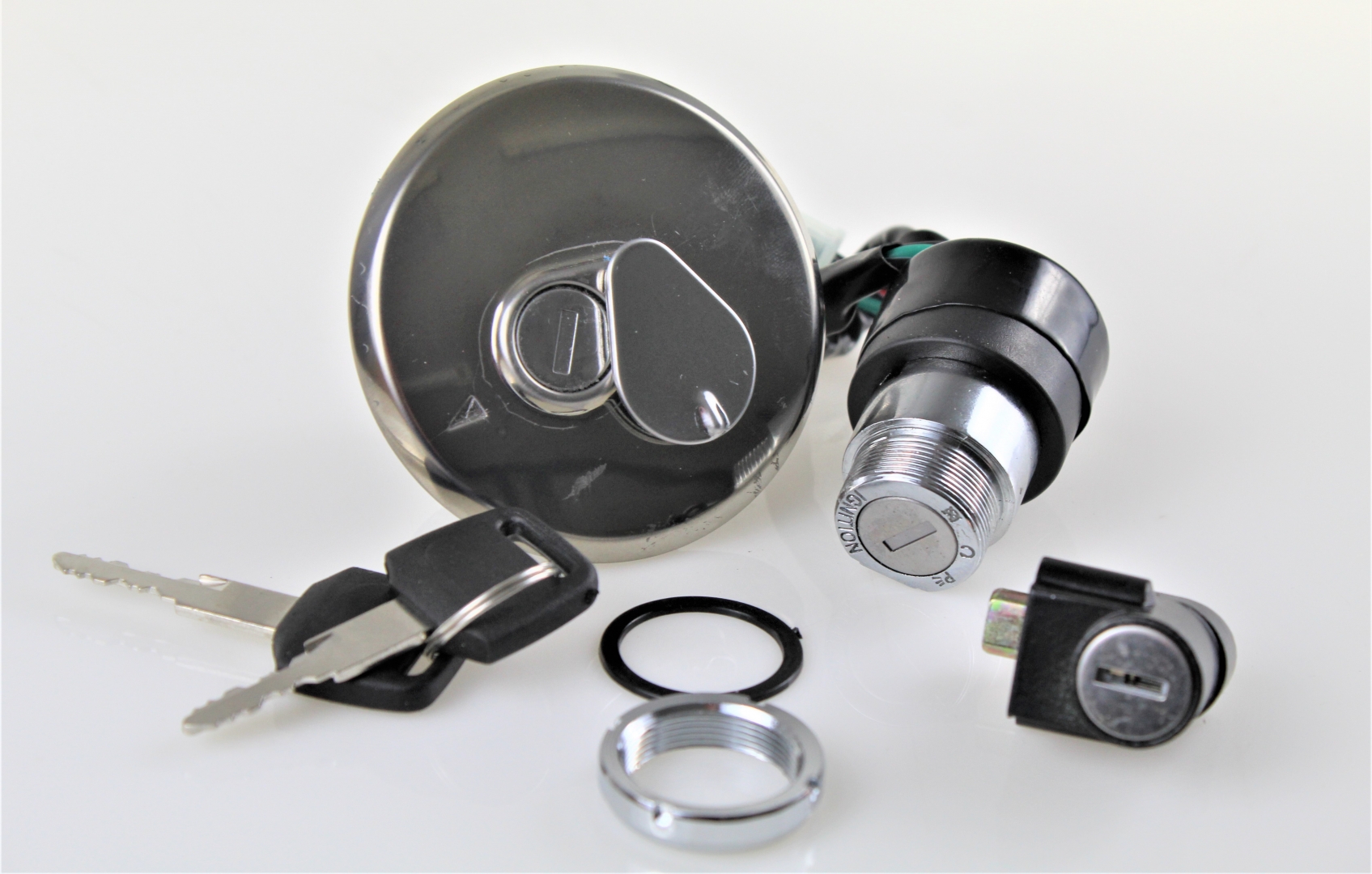 A szett tartalmazza a gyújtáskapcsolót, a tanksapkát, az ülés alatti tároló zárját és a kulcsokat.