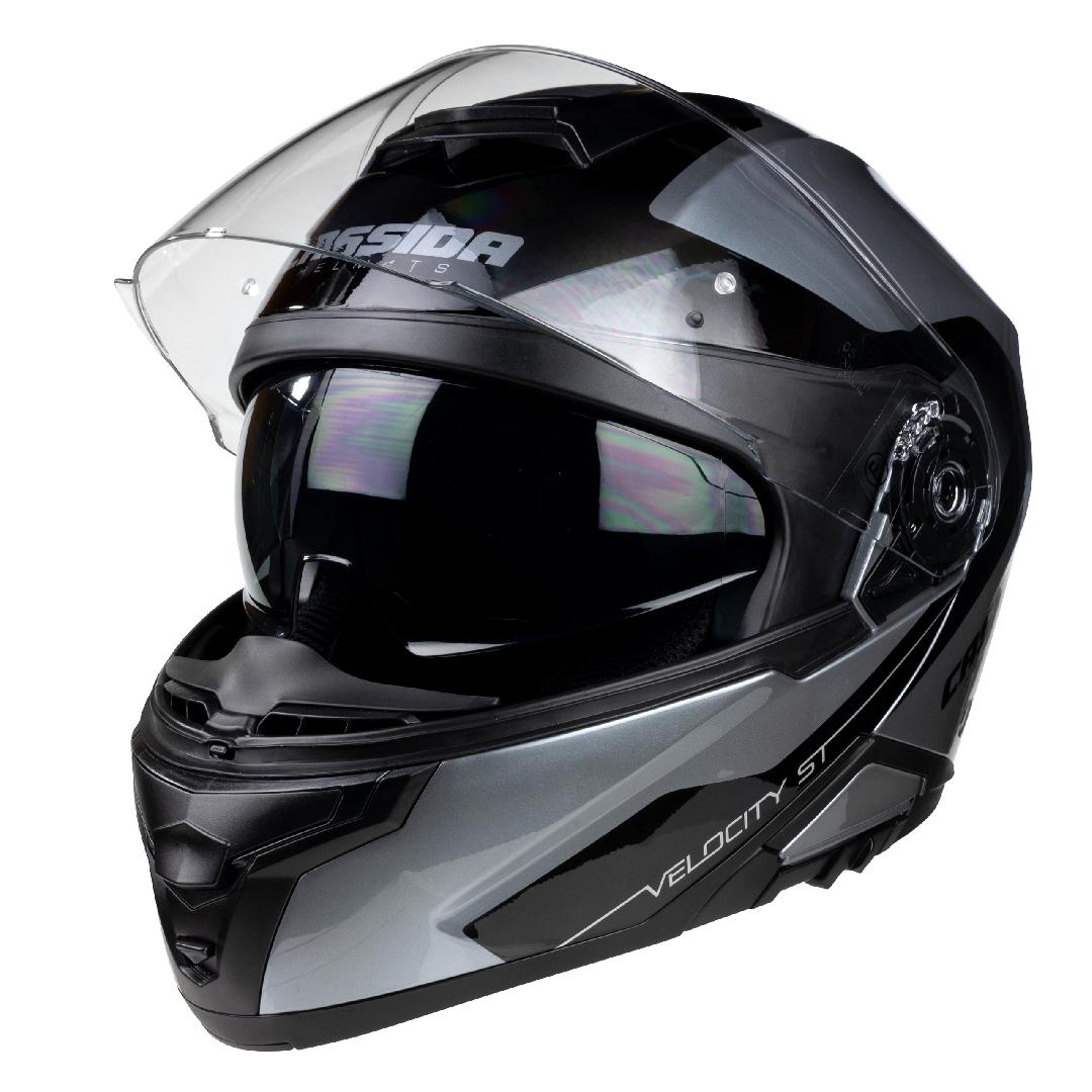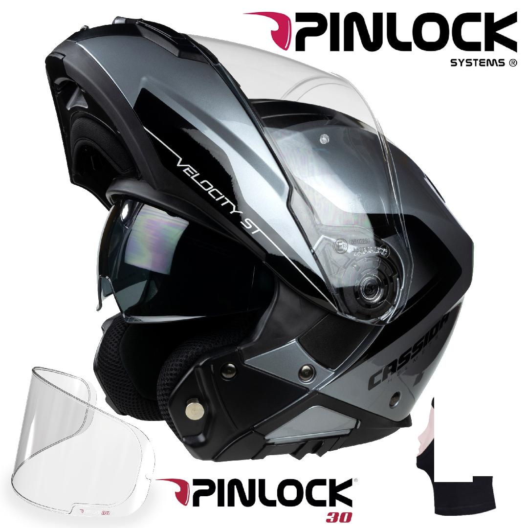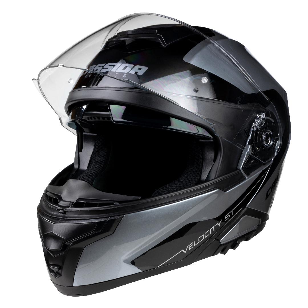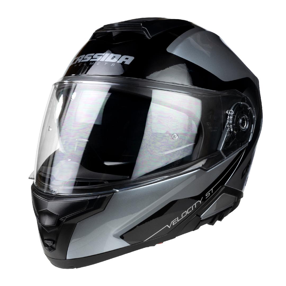 A Cassida Compress Velocity ST 2.1 nyitható álrészes bukósisak biztonságos polikarbonát héjjal rendelkezik, amely garancia az ütésállóságra. Beépített behúzható belső napszemüveggel, pinlock előkészítéssel.